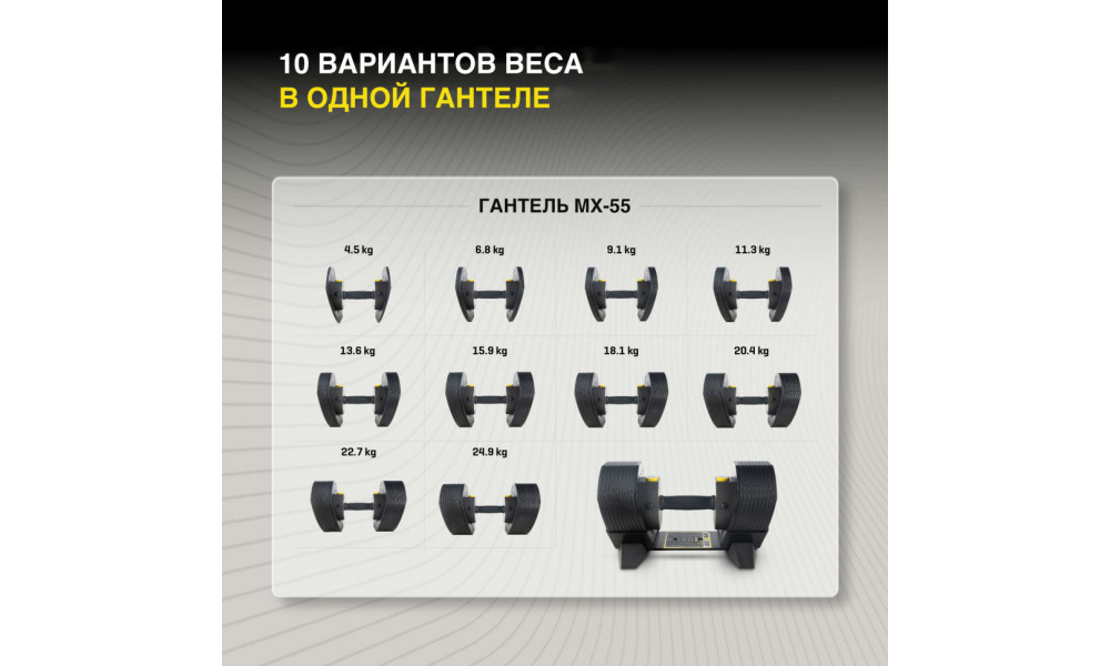 Гантель регулируемая MX Select MX55 имеет инновационный механизм для выбора веса от 4,5 кг до 24,9 кг. Вес 1 шага - 2,25 кг. MX Select MX55 сделаны из лучших материалов, их отличает высочайшее качество сборки, а гарантия составляет 2 года.