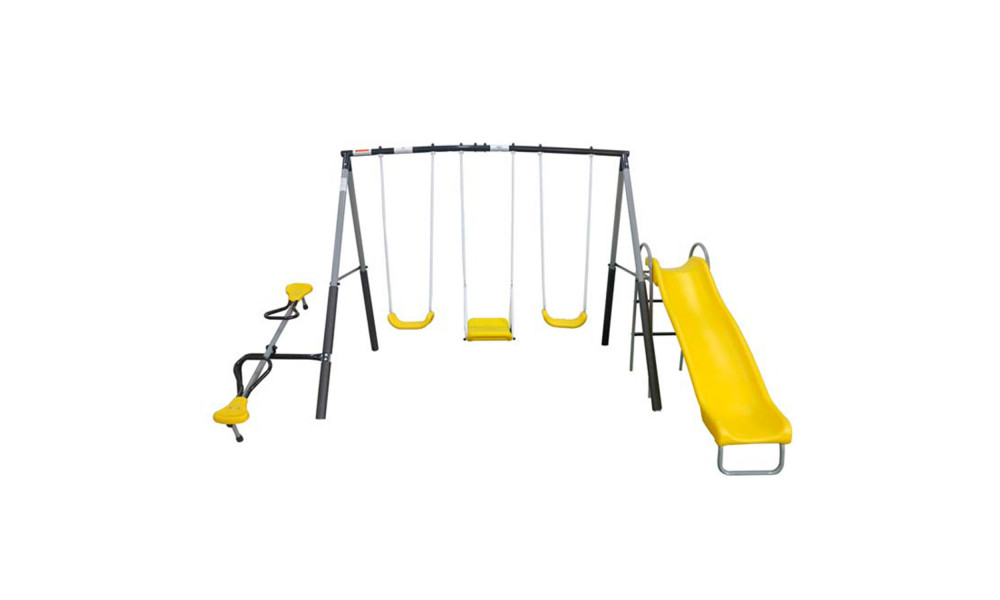 В комплекте: качели, качели-балансир, горка. Одновременно на комплексе могут находиться 6 детей, разрешенный возраст ребенка от 3 до 8 лет.